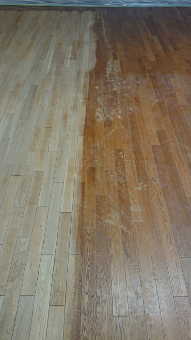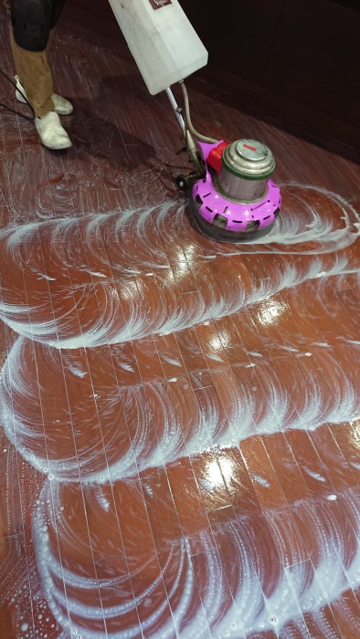 フローリングは弾性床材と違い長い時間剥離液を塗っておけないので少ないエリアを2~3回に分けて剥離を実施してきました。